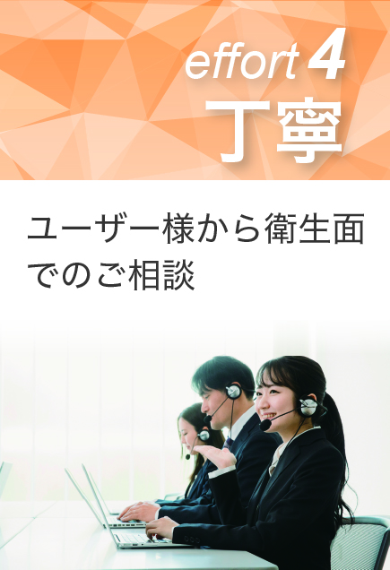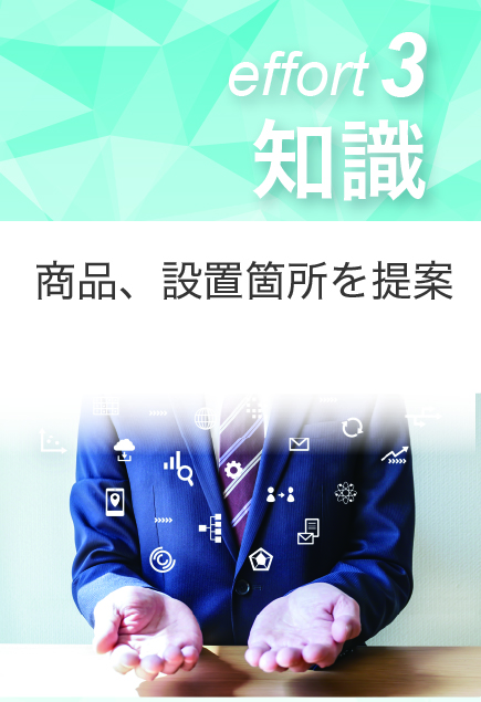 二十数店舗を抱えるユーザー様より衛生面での設備の標準化を相談されました。 弊社担当営業マンがすぐさま各店舗の現状を調査し、ユーザー様に合った商品・設置箇所をご提案、もちろん価格面にも配慮しました。 御納得されるまで何度もご商談。ご検討の結果ご採用いただけることになりました。 それからマニュアルの作成、メーカーを交えての講演会の実施。ソフト面にもぬかりはありません。